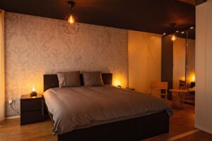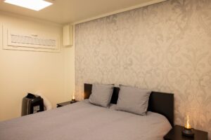 De grote woonunit heeft een afmeting van 6m x 5m en is uitgerust met een ruim bed van 1,8m x 2m, dressoir, grote kast, zithoek en een betegelde badkamer met eigen toilet en douche.